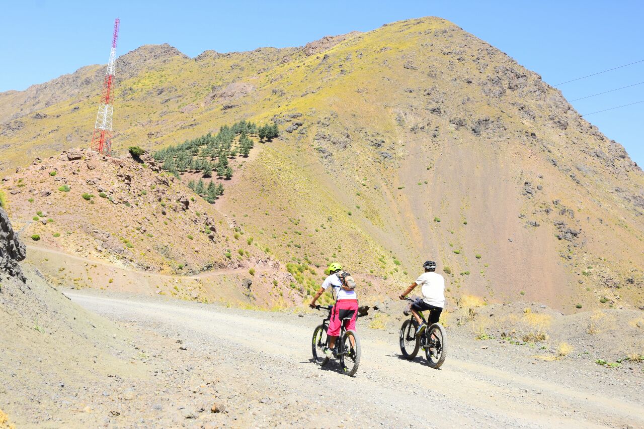 After a pick up from your hotel in Marrakech, you will drive to the Atlas Mountains, specifically to Imlil Valley, where you will be met by the local tour operator. After having a welcome tea at a guesthouse, you will get your bike and helmet, and set off riding on an uphill asphalt road towards Tizi n’ Tamatert Pass. From there, you will have amazing views over the Imlil and Imnane Valleys. After a short break there, you will carry on riding on the same asphalted road to the last village, called Tachedirt village, situated at an altitude of over 7700 feet (2350m). Once you get there, you will take an unpaved road downhill, passing by many Berber villages such as Ouanskra, Ikkis, Amsakrou, There you will have a stop for lunch before carrying on downhill to the town of Tingherine, then climb up again to the Pass before heading back to Imlil where you will spend the night.