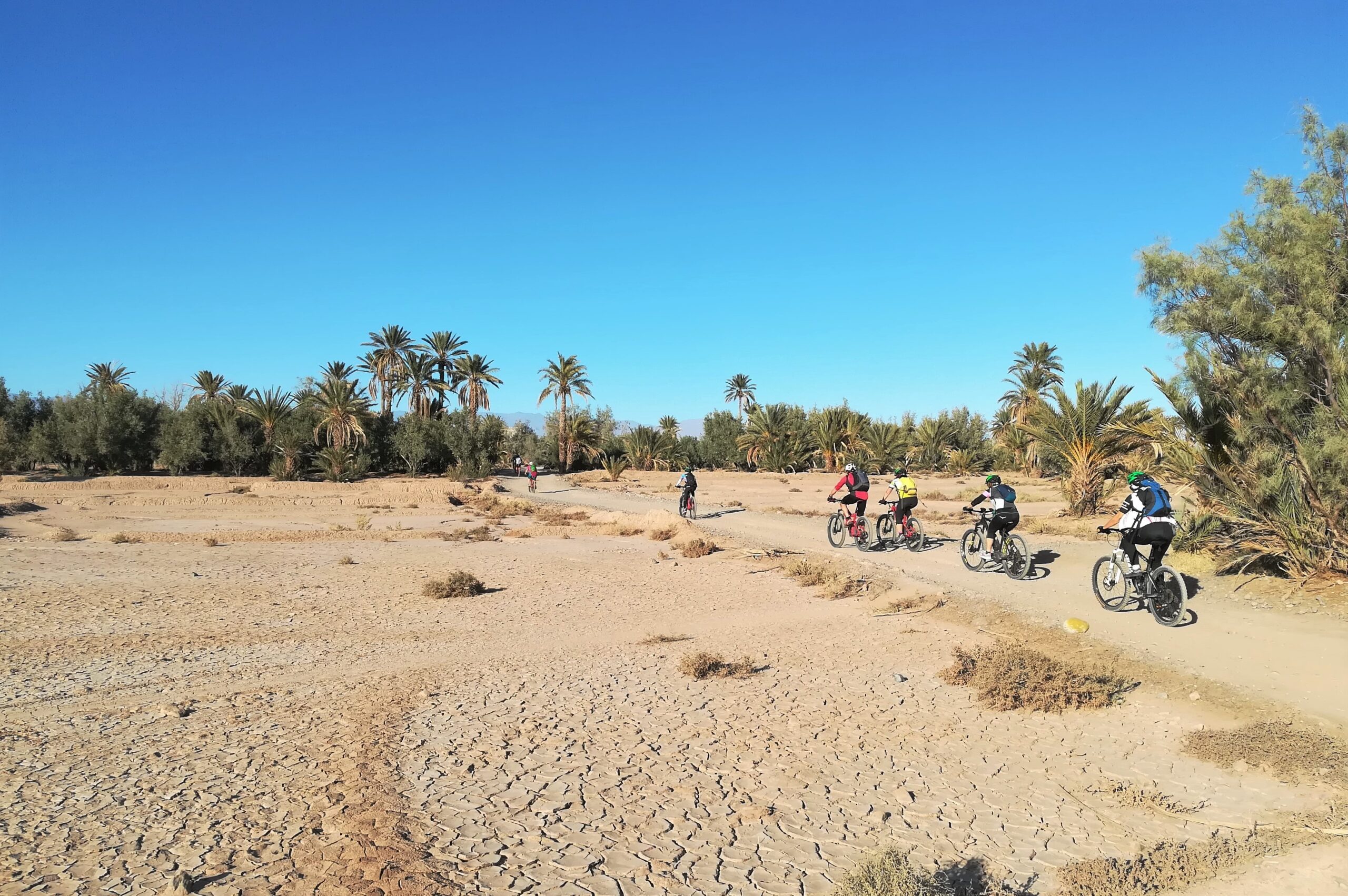 Biking from oasis to oasis through the Draa Valley Today the last bike stage and another scenic highlight are on the program. We bike under thousands of palm trees in the Draa valley from Oasis village to Oasis village. The Draa River flows from the Dades Valley through the reservoir in Ouarzazate to south-west Morocco over a length of over 1100 kilometres into the Atlantic Ocean. In spring, vegetables are grown in the fertile Wadi Draa. In autumn we nibble on the various sweet and ripe dates. After lunch, a transfer takes us back to Marrakech via Ouarzazate.