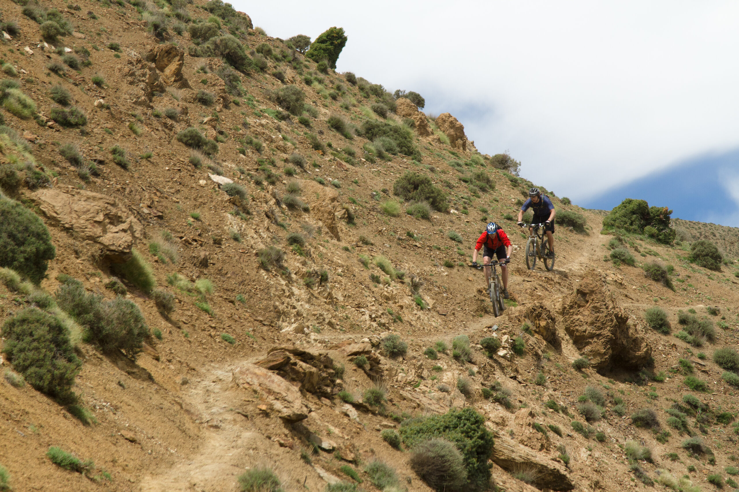 We start with a gentle traverse and climb to the head of the pass. This includes a 10 minute hike-a-bike but the rewards the top are incomprehensible! From here the singletrack is fast and flowing to start and as it drops in height becomes more technical into the riverbed. One of the sections of singletrack runs through a dry riverbed. From slow, super technical to smooth and flat out and everything in between! This continues for hours, without a letup anywhere. The finale is a rickety bridge crossing which takes us to the van for a late lunch. After lunch you can either transfer in the van to Ijoukak for the last night in the Mountains.